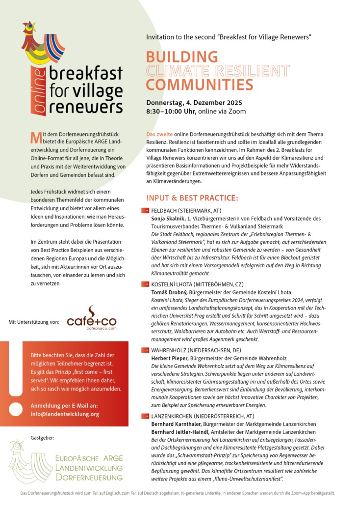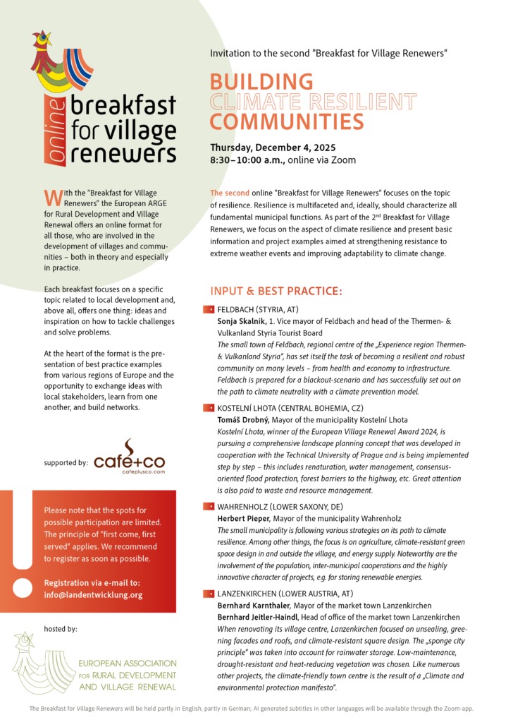 „Building Climate Resilient Communities“ ist das Thema des 2. online Dorferneuerungsfrühstücks am 4. Dezember 2025.